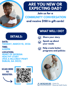 Calling all Dublin, GA, parents and families! Come join us Tuesday, March 10, 2026, as we engage in focus groups for fathers and mothers as part of Project SOAR. $150 in gift cards and lunch provided! Invite your community members who are pregnant or recently gave birth, and help us improve our communities’ health resources. See you soon! Click here or scan the QR code on the flyer below to sign-up!